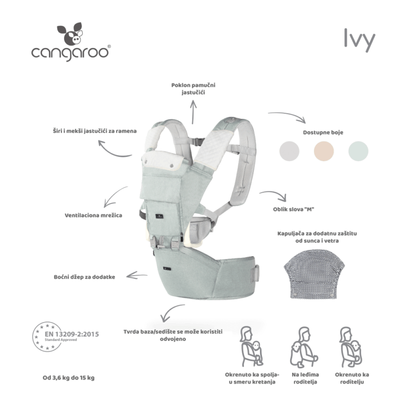 Nosiljka za bebe Ivy pruža maksimalnu udobnost i sigurnost tokom nošenja. Sa tri položaja nošenja, mekanim jastučićima i mrežastom unutrašnjošću koja omogućava bolju ventilaciju, Ivy je idealna za decu od 5 meseci do 15 kg. Dobitnik nagrade Mother & Kids Awards 2025, pruža roditeljima slobodu pokreta uz bliskost i sigurnost za bebu.