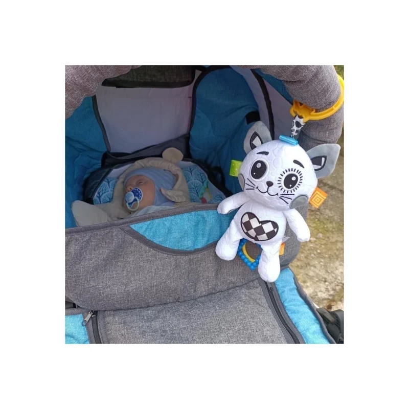 Plišana igračka za bebe Bali Bazoo – Muzikalna maca uspavljuje mališane slatkom uspavankom. Povlačenjem plastičnih prstena na dole aktivira se prijatna muzika. Kontrastne boje i šarene etikete sa različitim teksturama stimulišu bebin osećaj vida i dodira.